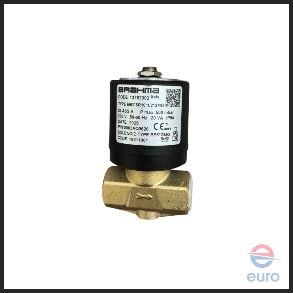 Brahma Gas Solenoid Valve complete set with coil. Type: E6GSR101/2GMO, 230 Volt, 50/60 Hz, 20 VA, Pmax 500 Mbar. Gas Solenoid Type BE6GMO. Code: 13762002/18811001. Made in Italy.