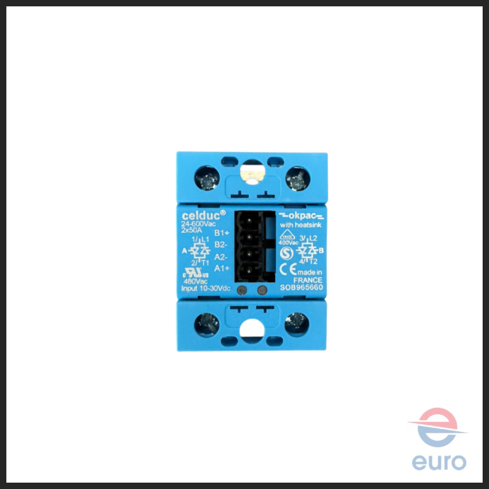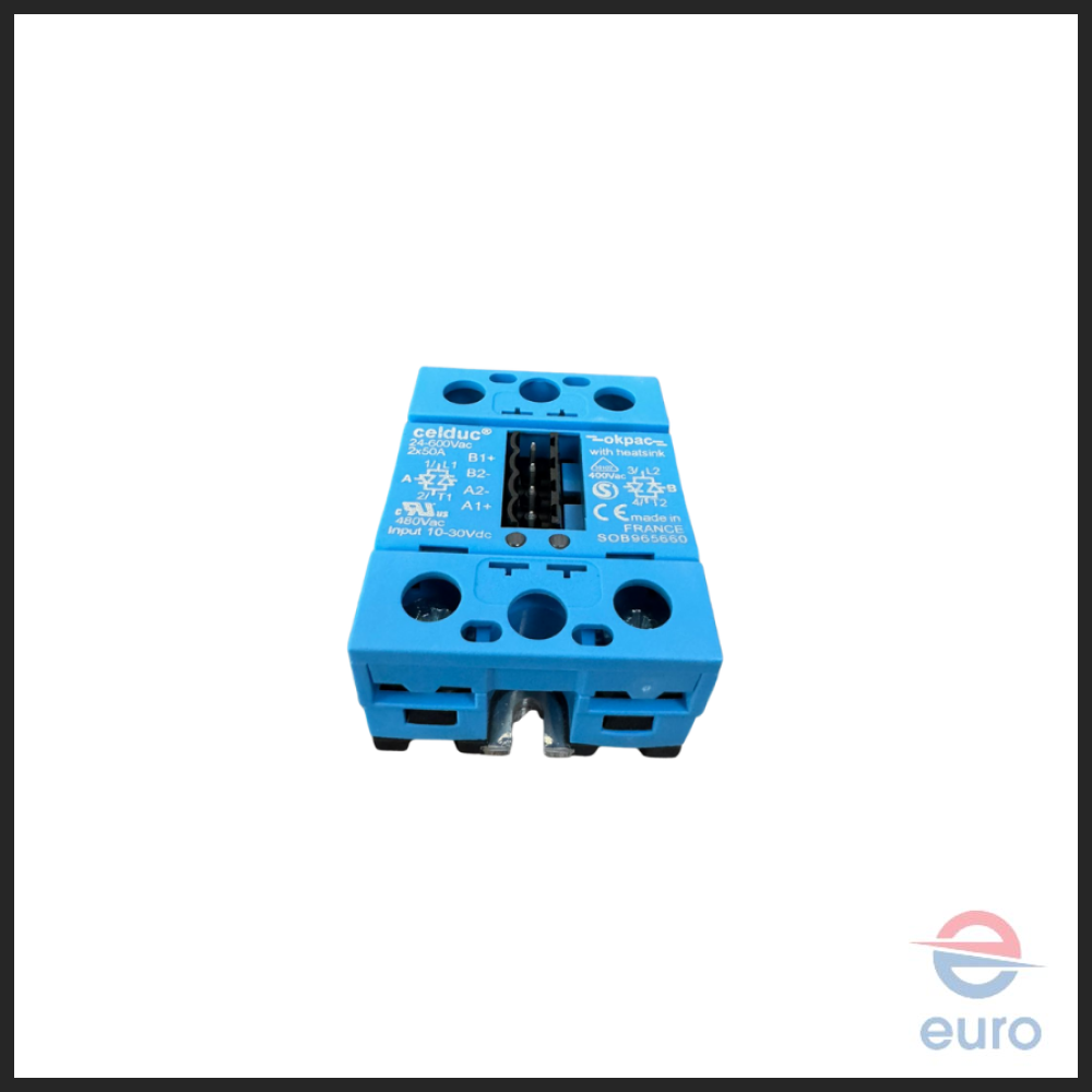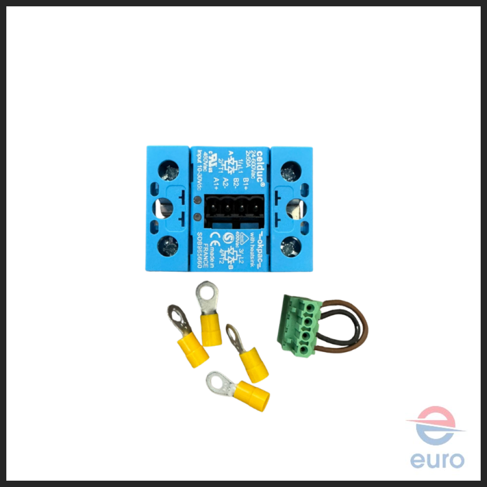 Hygromatik Solid State relay 50 A used for HL12-24, HC12-27 & DL12-27. This relay comes without cooler two phases switching. This high-quality CELDUC OKPAC relay supplied with wire legs and connection jumper and heatsink. The OEM code for this relay is B-2602109. 24-600 VAC, 2 x 50 A, Made in France.